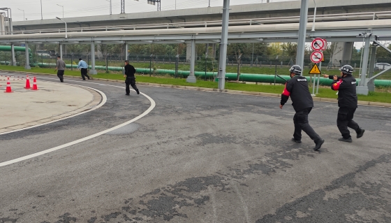 演練現(xiàn)場,中隊長首先為隊員講解了防暴盾牌、鋼叉、防暴棍等器械的使用方法,明確了各個崗位的職責(zé)及人員的分工站位。演練模擬三名“歹徒”闖入園區(qū)危化品倉庫,安保人員立即按下一鍵報警裝置,并迅速拿起防暴器械與“歹徒”進行周旋,同時大聲呼喊,提醒周圍人員疏散避險。聽到警報聲后,中隊隊員迅速響應(yīng),按照預(yù)定的應(yīng)急預(yù)案,運用戰(zhàn)術(shù)技巧,逐步將“歹徒”逼至角落制服,解除了危機。